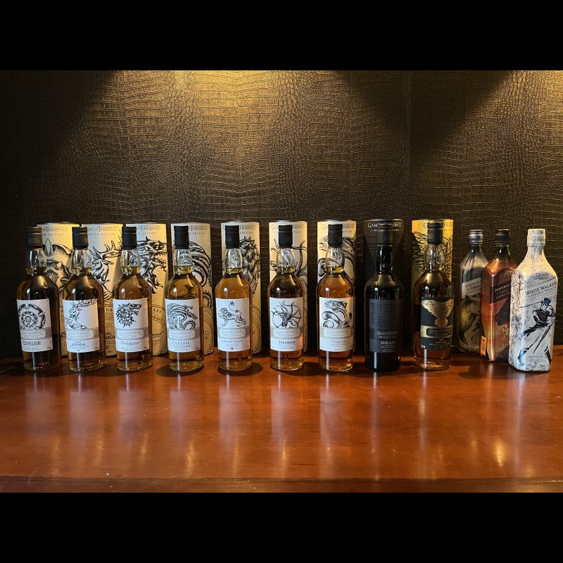 Ik bied hierbij mijn complete Game of Thrones Single Malt Scotch Whisky Collection aan. Deze iconische limited edition serie is uitgebracht door Diageo in samenwerking met HBO en is wereldwijd zeer gewild onder verzamelaars van Game of Thrones memorabilia en premium Scotch.